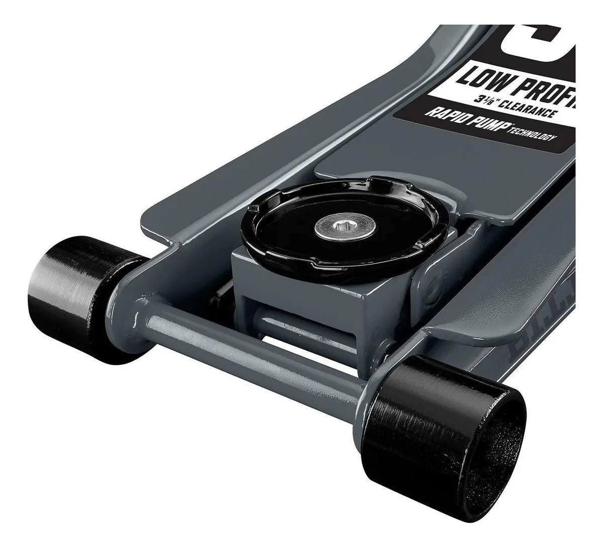 Este gato para automóvil de 3 toneladas eleva los vehículos a casi dos pies del suelo. Un parachoques protector de espuma en el mango del gato protege las superficies del vehículo contra daños. La tecnología RAPID PUMP® de doble pistón levanta la mayoría de las cargas de trabajo en solo 3-1/2 bombas.